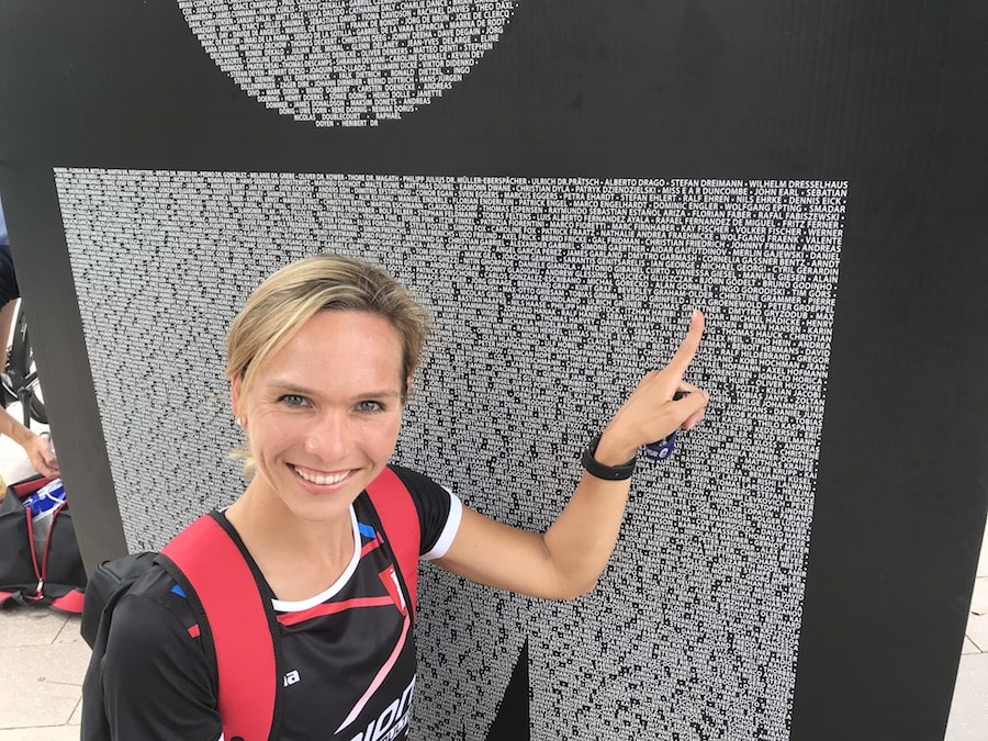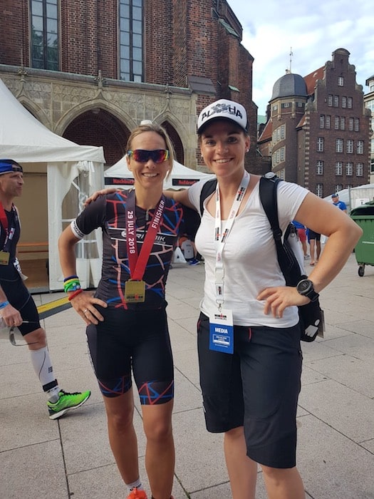 Das Gefühl ist unbeschreiblich. Sofort bekomme ich eine fleißige Helferin an meine Seite, die mich zur Verpflegung bringt. Für jeden Finisher gibt es eine Person, die im Notfall helfen kann und für einen da ist. Das finde ich super, denn so langsam habe ich Angst um meinen Kreislauf. Im Verpflegungs-Village angekommen, gibt es erst einmal ein alkoholfreies Bier, ein Franzbrötchen und meine Wechselkleidung sowie das Finisher-Shirt. Ich bin überglücklich und bedanke mich noch einmal bei Kathrin (Foto), die mich als erfahrene Triathletin auf dem ganzen Weg zum IRONMAN begleitet hat. Du bist mir eine große Hilfe!