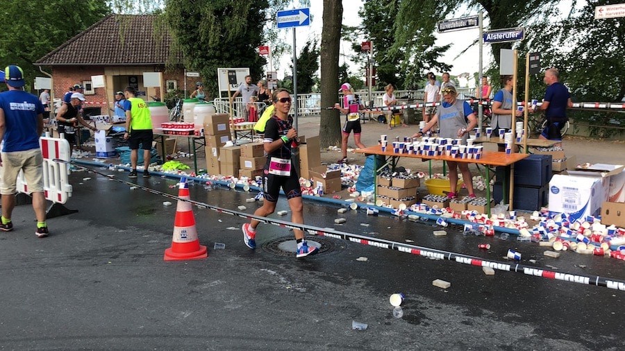 Mittlerweile knallt die Sonne nicht mehr ganz so stark auf meinen schwarzen Einteiler und ich rede mir ein, jetzt wird es nur noch leichter. Anscheinend ergeht es nicht jedem so. 50% der Athleten sind mittlerweile in einen Gehmodus gewechselt. Ob es ihre 1.,2.,3. oder 4. Runde ist, erkennt man an den Bändchen, die man Runde für Runde am Gänsemarkt umgehängt bekommt. Ich ermutige den einen oder anderen nicht aufzugeben und weiter zu joggen, doch die Hitze macht wirklich einigen sehr zu schaffen.