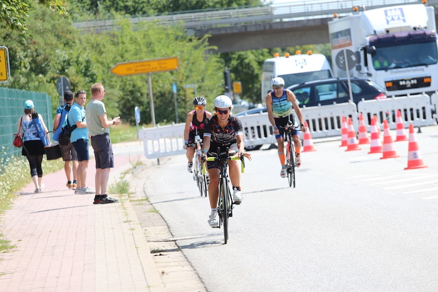 Eine Runde nach Geesthacht und zurück … und das Ganze dann zwei Mal. Macht insgesamt 180 Kilometer. Die erste Runde läuft erstaunlich gut. In der 2. Runde kämpfe ich mit dem Gegenwind. Wo kommt der denn auf einmal her? Nun denn, nach ca. 30 Kilometern ist er verschwunden und ich spüre eine Art Runner´s High auf dem Rad. Heißt das dann Biker´s High? Mittlerweile sind die Profis an mir vorbei gedüst. Jeder mit einer eigenen Begleitung auf dem Motorrad. Ich radele Mutterseelen allein, denn dichtes Auffahren oder sogar Unterhaltungenm, die gleichzeitig Windschatten mit sich bringen, werden vom IRONMAN bestraft. Durch Windschatten-fahren hätte ich nämlich einen klaren Vorteil. Für mich gilt, Fairplay wie man so schön sagt. „Mogeln“ ist keine Option, da alle 300-500 Meter Kontrolleuere stehen. So ganz alleine bin ich demnach nicht, dennoch fällt es einer Frau wie mir schwer sechs Stunden gar nicht zu reden und sich nur auf die Radstrecke zu konzentrieren und vielleicht Gespräche mit meinen Haribo Schlümpfen (meine Verpflegung) zu führen.